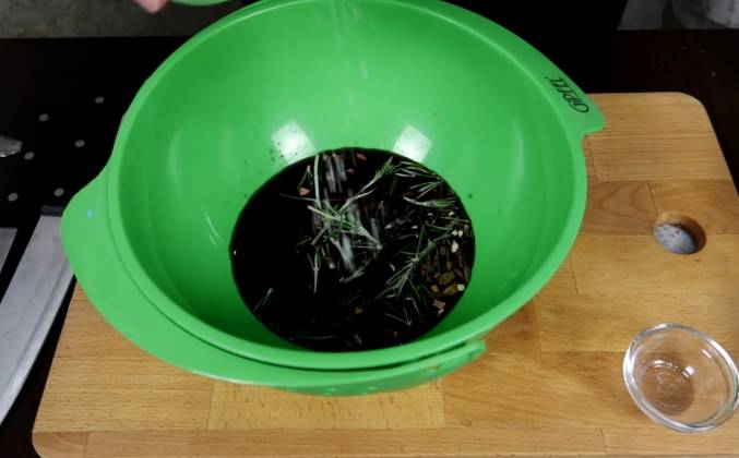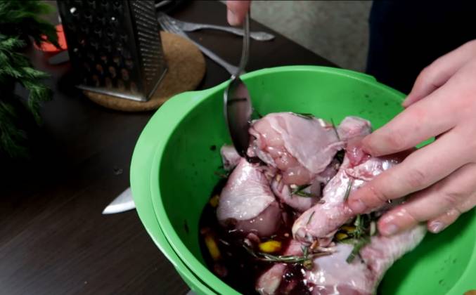 2.  Хорошенько все перемешиваем и убираем мариноваться минимум на один час. Ну вот прошло время, наша курочка хорошенько замариновалась, самое время выложите ее в форму для запекания и отправить в духовку. Смотрите какой необычный оттенок за счет красного вина она приобрела. И заливаем оставшимся маринадом. Добавлю сюда специи из маринада, закрываем фольгой и отправляю в разогретую до 190 градусов цельсия духовку на 30 минут. Ну что, 30 минут прошло давайте посмотрим что у нас получилось. У нее такой забавный фиолетовый цвет пока что. Но стойте, дайте ей запечься и она покроется аппетитной, румяной корочкой. А теперь уже без фольги отправляем ее запекаться еще на 30 минут при 200 градусах цельсия.