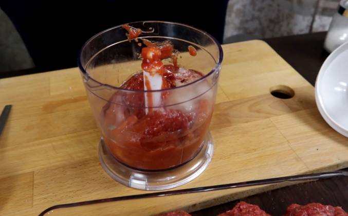2. Примерно по 50 60 грамм, вот такие замечательные шарики. Ну и какие же итальянские тефтельки без томатов? Поэтому я буду готовить томатный соус на основе томатов в собственном соку, можно брать свежие просто очистив их от шкурки. Я хочу измельчить всё до однородной пасты в блендере. Я перекладываю все помидоры в блендер, добавляю туда немного соли, сахар, растительного масла и измельчаем. Великолепно!