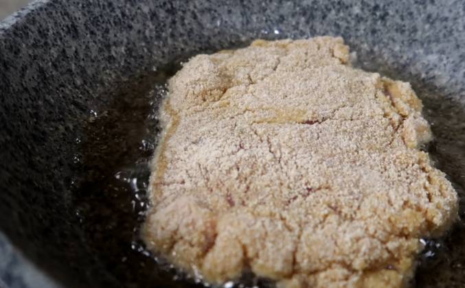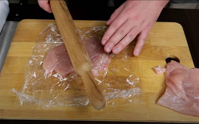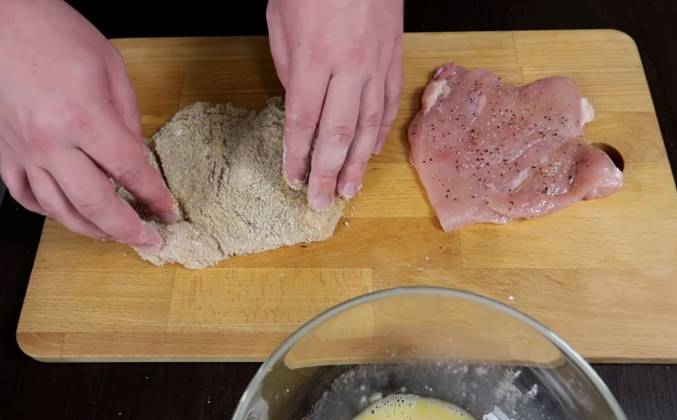 2. Вот так! Отлично, теперь нам нужно посолить и поперчить нашу курицу с двух сторон. Теперь каждую куриную грудку нам нужно обмакнуть в муку, в яйцо и в панировочные сухари. Даем шницелю обсохнуть буквально 30 секунд и повторяем процедуру с яйцами и панировочными сухарями. Отлично! Нагреваем сковороду, наливаем туда хорошее количество растительного масла и выкладываем на раскаленное масло шницель.