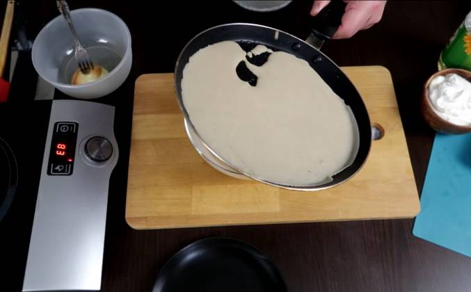 2. Тесто получается слегка коричневого оттенка, кремовая структура. Все конечно зависит от гречневой муки, если у вас получается тесто более вязкое - ничего страшного! Можно добавить еще 50 миллилитров воды прямо сейчас. Я буду обжаривать эти блины как обычно: смазываю сковородку маслом и обжариваю блинчики с двух сторон. Смазываем маслом и наливаем небольшое количество теста, распределяем круговыми движениями и аккуратно снимаем. Ждем когда сверху полностью подпечется, после чего переворачиваем на другую сторону.