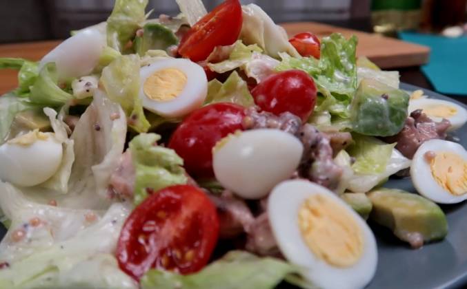 2.  Щепотка соли, свеже молотого перца и буквально столовая ложка растительного масла. Хорошенько все перемешиваем. Великолепно! Из овощей я буду использовать салат айсберг, авокадо и томаты черри. Нарезаю листья салата крупными кусками и перекладываем их большую миску. Разбираем по сегментам. И нарезаем авокадо. Вынимаем мякоть при помощи ложки. Нарежем нашу курицу. Сразу подготовим помидоры черри, просто нарежем напополам и перепелиные яйца. Можно использовать и куриные яйца.
