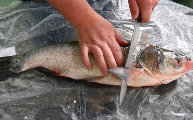 Как приготовить шашлык из рыбы на мангале рецепт. У меня сегодня такая замечательная, хорошая рыба, килограмма на два с половиной. Это карп, но сегодняшним рецептом вы можете готовить как карпа, как толстолобика, скумбрию, вообще практически любую рыбу. Но желательно выбирать какую-то крупную. Я не из тех людей, которые любят готовить рыбу целиком, потому что на мой взгляд это получается не шашлык, не гриль, а больше вареная рыба. Поэтому мы ее подготовим, наденем на шампуры и пожарим прям по красоте, чтобы было вкусно.