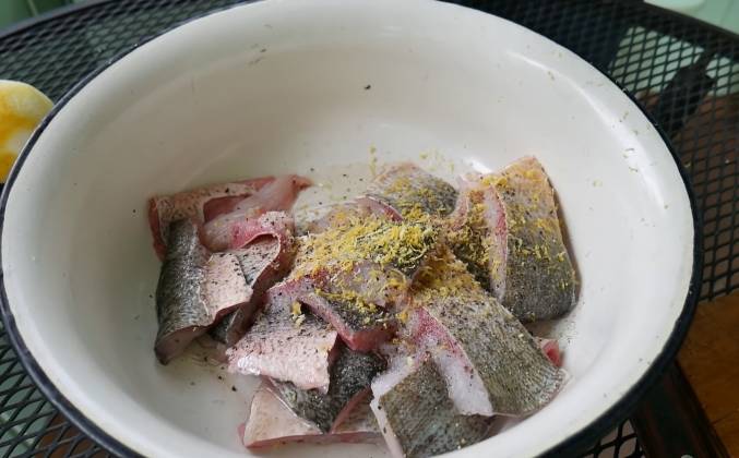 2. Поэтому просто ножом вот на такие кусочки толщиной примерно три сантиметра. И теперь маринад. Маринад это основной вкус нашего шашлыка. Специи и вообще все пряные вещества раскрываются в двух вещах - в воде и в масле, есть еще спирт, но мы не будем его использовать. Мы будем использовать воду, то есть ту влагу, которая есть в рыбе и растительное масло, которое не даст нашей рыбе пересохнуть подгореть и в то же время раскроет максимальное количество вкусов у наших специй. Дальше у нас идет свежемолотый перец. Сильно много не надо, толстолобик рыба нежная, но тем ни менее хорошо перчим. Супер ! Теперь обязательно для того, чтобы оттенить немножко рыбный привкус, который не всем нравится, будем использовать лимонную цедру. Две хорошие щепотки соли и я настоятельно рекомендую использовать для маринада укроп.