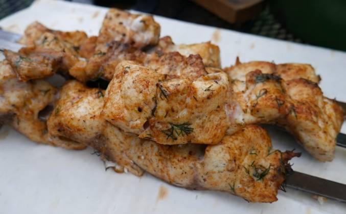 3. Укроп вообще отлично сочетается с рыбой. Буквально несколько веточек. Так вот прям подавить их и пускай маринуется вместе с рыбой, мы его потом уберем. И немного сладкой паприки. Класс! Рыбе много мариноваться не нужно, буквально оставим ее на 20-30 минут. Можно разжигать угли, за это время готовить шампуры и отправляемся жарить. Погода нам улыбнулась, дожди прекратились, мы вышли на улицу, давайте жарить нашу рыбу! Я буду насаживать ее на шампуры на небольшом расстоянии друг от друга. Шкуркой стараемся делать в одну сторону, чтобы у нас со всех сторон обжаривалось равномерно Конечно параллельно очищаем от укропа, каких-то кусочков маринада, если такие попадаются. Красота!