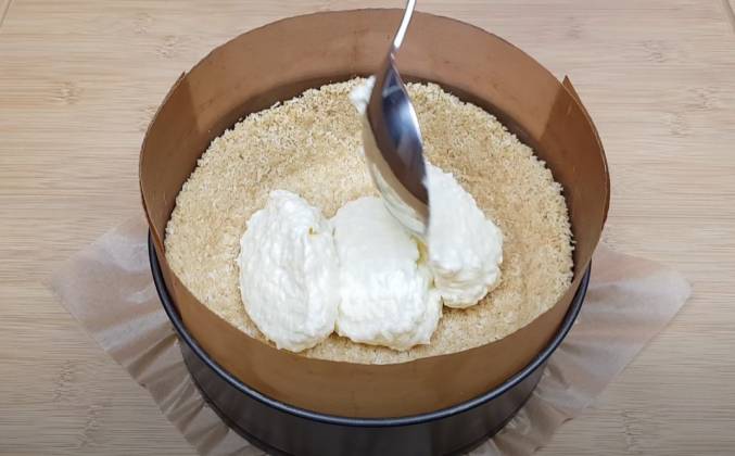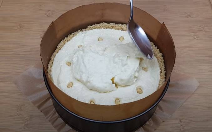6. Крем готов, перекладываем часть крема в форму и равномерно разравниваем. Для начинки нам понадобится 40—50 граммов очищенных миндальных орехов. Половину орехов втыкаем в крем. Сверху выкладываем ещё часть крема. Крем равномерно разравниваем. В крем втыкаем оставшиеся орехи. Выкладываем оставшийся крем и равномерно разравниваем. К ранее отложенной крошке добавляем 1 ст. ложку кокосовой стружки и перемешиваем до однородно состояния.