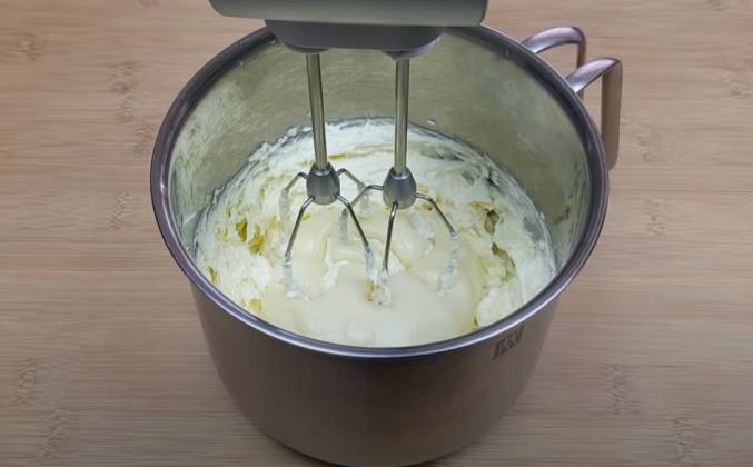 5. Во взбитое сливочное масло добавляем часть заварной основы. Взбиваем на максимальных оборотах миксера до однородного состояния. Так постепенно соединяем всю заварную основу с маслом. Чтобы крем не расслаивался при взбивании, сливочное масло и заварная основа, должны быть одной комнатной температуры. Когда всю заварную основу соединили с маслом, всыпаем в крем 100 граммов кокосовой стружки. И перемешиваем до однородно состояния.