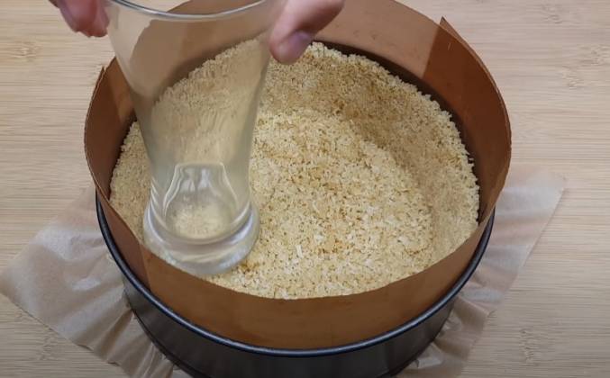 2. Если крошка их печенья не держит форму, то надо добавить еще 1 ст. ложку молока. Отложим 1 ст. ложку крошки , этой крошкой мы в конце украсим верх торта. Торт я собираю в разъёмной форме диаметром 18 см. Перекладываем крошку в форму, разравниваем и формируем бортики. Я делаю бортики высотой примерно 4,5 см. Края прессуем ложкой, хорошо прижимаем бортики к форме. Дно утрамбуем стаканом. Это будет наша основа. Убираем основу в холодильник, и приготовим крем. В кастрюлю высыпаем 100 граммов сахара. И 40 грамм пшеничной муки. Перемешиваем до однородного состояния.