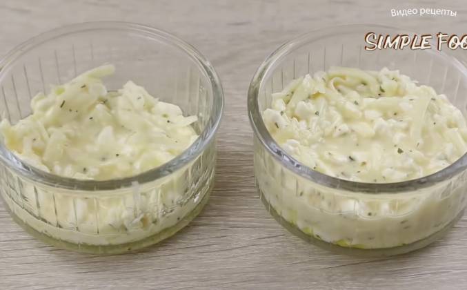 2. Хорошенько перемешаем соду в крахмале и еще раз миксером все хорошо собьем, буквально минутку. Теперь берем твердый слегка соленый сыр и нам нужно его натереть на крупной терке. Я взяла 200 грамм сыра, но поверьте это совсем не много, вкуснотища будет просто пальчики оближешь. Вы можете колличество сыра регулировать сами, высыпаем сыр в емкость во взбитую смесь. Добавляем смесь итялянских трав, или любимые ваши специи и аккуратно перемешиваем ложкой пару раз. Вот такая масса у нас должна полусится. Теперь подготовим емкости. У меня вот такие порционные стекляные, специально для запекания. Берем немного оливкового масла и кисточкой смазываем донышко и бортики каждой формы. На это колличество продуктов у меня получится 4 формы, которые вполне хватят для 4 человек, это будет очень сытно.