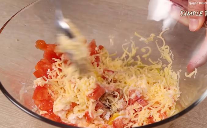 3. Пока картошка с мясом запекается подготовим остальные ингредиенты, нам понадобится 1 помидор, его нужно нарезать достаточно мелко. Сыр натираем на мелкую терку. Натертый сыр и помидор отправляем в глубокую емкость туда же разбиваем 1 яйцо, добавляем 1 столовую ложку майонеза, немного соли и черного молотого перца. Хорошо все перемешиваем. К этому моменту картофель с мясом и овощами уже можно доставать из духовки. Снимаем фольгу и сверху выкладываем сыр с помидорами и яйцом. Равномерно все распределяем и снова отправляем в духовку ещё на 20 минут но уже фольгой накрывать не нужно. Аромат просто невероятный. Блюдо получилось очень аппетитным вкусным и сытным.Видео рецепт ютуб ниже 👇