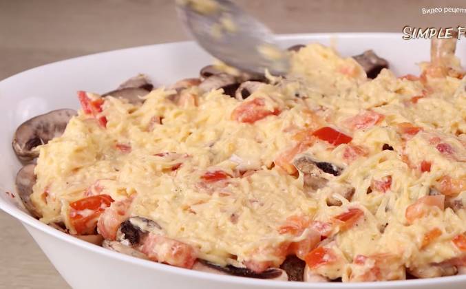 Куриное филе с картофелем в духовке как запеканка с помидорами, с корочкой из сыра с шампиньонами и луком.