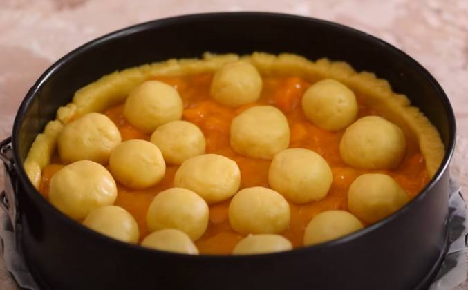 4. Из оставшегося теста скатать шарики весом 10-15 грамм, выложить шарики поверх абрикосовой начинки. Выпекать в заранее разогретой духовке 40-45минут, до готовности. Пирог должен приобрести слегка золотистый цвет. Готовому пирогу дать остыть на решетке, после подавать к столу. Приятного аппетита!Видео рецепт ютуб ниже 👇