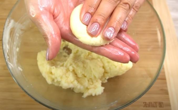 2. Каша должна получится достаточно густой, она должна вот так отходить от кастрюли. Снимаем с огня и сразу добавляем сливочное масло 50 гр., перемешиваем. Теперь сразу приступаем к лепке манников. Берем примерно 1 ст.л. массы, по весу 50 грамм, катаем колобочки и делаем лепешечку. Я формирую обычно при помощи сервировочного кольца, делаю колбочек кладу в кольцо и специальной крышечкой прижимаю, вот такие красивые манники получаются. Из данного количества у меня получается 10 штук.