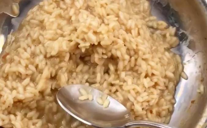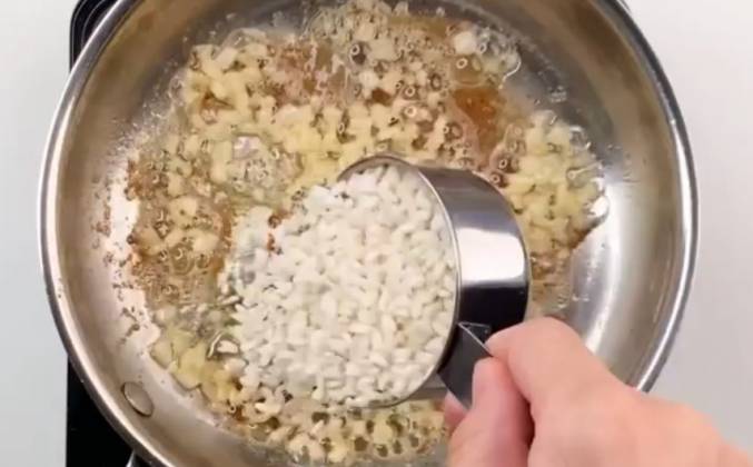 2. В эту же сковородку добавь кусочек сливочного масла и обжарь 3 минуты лук. Теперь добавь рис и жарь, помешивая ещё 3 минуты. Сейчас можно добавить белое сухое и выпарит его. Теперь по половнику добавляй бульон и готовь пока жидкость не впитается, теперь ещё один половник и так до тех пор пока рис не будет готов аль-денте.