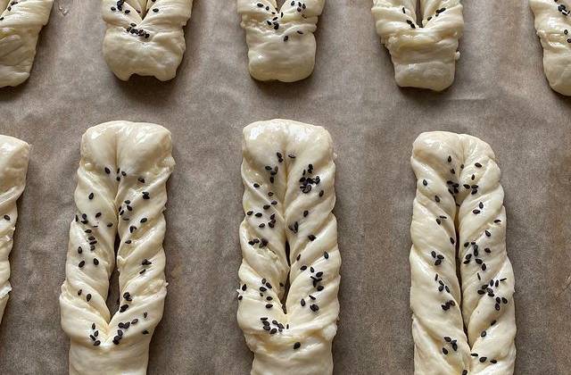 4. С другой частью теста поступить точно так же. Уложить булочки на противень, застеленный бумагой для выпечки, накрыть пленкой, дать подойти. Перед выпечкой смазать взбитым яйцом, посыпать кунжутом. Выпекать при t 180 гр 15-20 минут до зарумянивания. Ориентируйтесь на особенности своей духовки.
