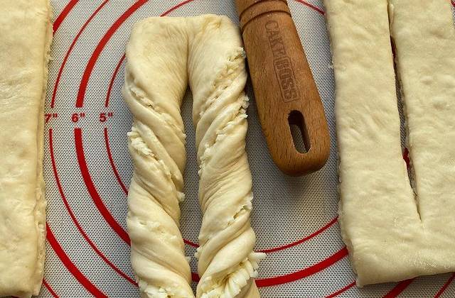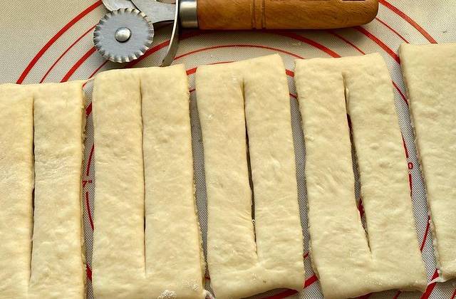 3. Треть прямоугольного пласта завернуть к середине, а вторую треть поверх первой. Получится узкий прямоугольный пласт теста, который нужно разрезать на 9-10 частей. В каждой сделать надрез не доходя до краев 1 см, затем каждый конец вывернуть. Получится красивая булочка( см. фото в карусели).
