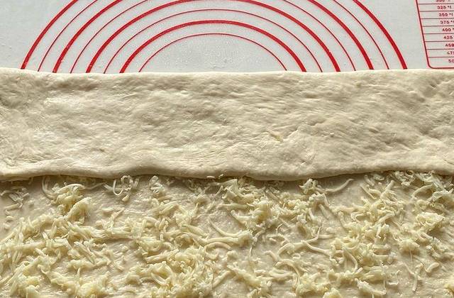 2. Для начинки сыр натереть на крупной или средней тёрке. Подошедшее тесто разделить на две равные части, каждую раскатать в прямоугольный пласт , ширина раскатки 0,5 см. Если тесто липковатое, пользуйтесь мукой. Пласт теста смазать размягченным сливочным маслом , посыпать тертым сыром.