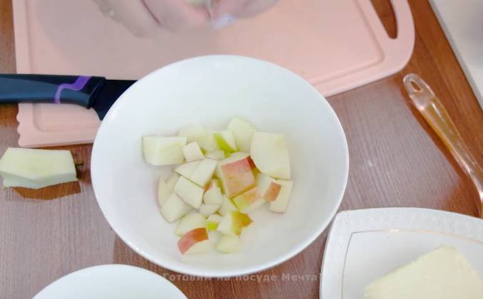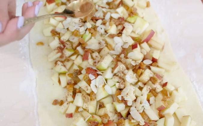 2. Сейчас я слоями выкладываю начинку. Я ее предварительно не варю, не замешиваю, мне нравится вот так. Первым слоем у нас идут яблоки. Следующий слой у нас изюм. Дальше добавляем немного миндаля, можно заменить его грецким орехом.