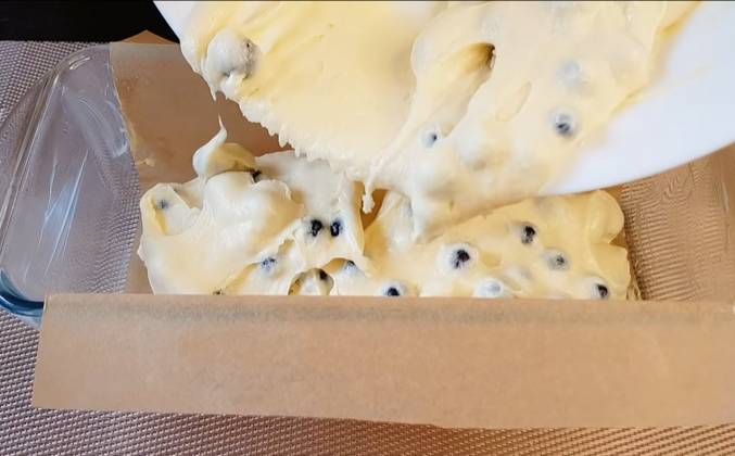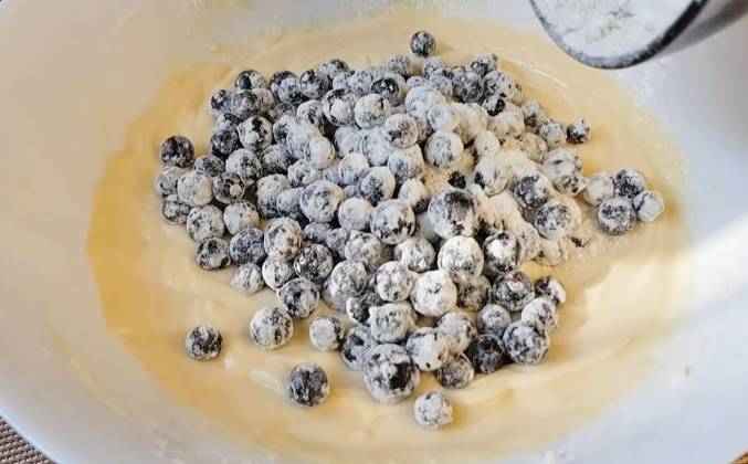 2. Всыпаю 200 г муки и перемешиваю. Половину чайной ложки соды гашу уксусом, добавляю к тесту. В конце всыпаю подготовленные ягоды, аккуратно перемешиваю ложкой. Форму для кекса 25*11 см (можно использовать круглую форму диаметром 20 см) застилаю пергаментом, свободные стенки смазываю сливочным маслом. Выкладываю тесто. Равномерно распределяю его. Ставлю выпекаться в заранее разогретую до 170С духовку. Готовлю глазурь. 50 г сахарной пудры смешиваю с 1 ст л лимонного сока.
