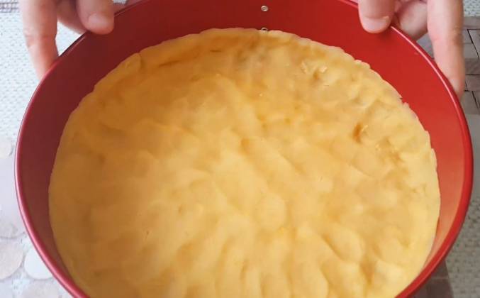 2. Оставшееся тесто выкладываю в разъёмную форму, застеленную пергаментом. У меня форма 24 сантиметра. Формирую небольшие бортики 1,5-2 см высотой. И убираю форму в холодильник. Для суфле 200 гр йогурта (можно брать сметану любой жирности) смешиваю с 20 г крахмала и 40 г сахара. Хорошо перемешиваю. Два белка взбиваю, постепенно добавляя в них 40 гр сахара. Взбиваю в устойчивую пену. Соединяю белковую и йогуртовыю массы. Аккуратно перемешиваю ложкой. Масса для суфле готова. Достаю форму с тестом из холодильника. Смазываю джемом. У меня абрикосовый. Можно брать любой джем или варенье.