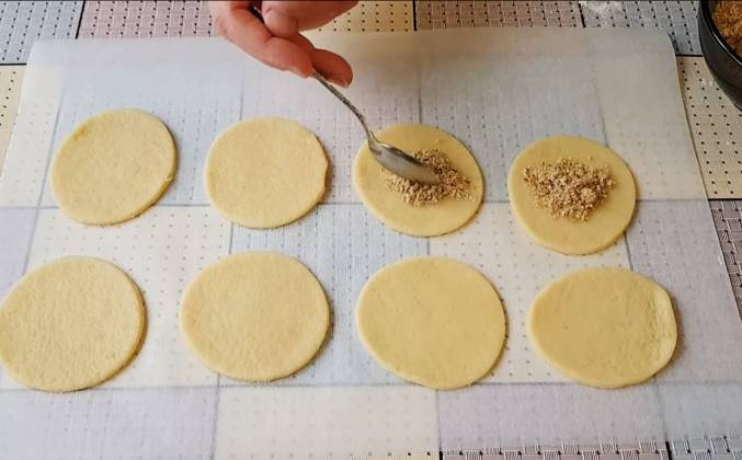 2. Вот такое мягкое тесто получилось. Кладу его в пакет и убираю в холодильник на 25-30 минут. Для начинки 40 гр поджаренных грецких орехов и 40 гр сахара измельчаю блендере в мелкую крошку. Начинка готова. Тесто достаю из холодильника. Делю на две части. Раскатываю в тонкий пласт. Толщина около 2 мм. Круглой выемкой, диаметром 9 см, вырезаею заготовки. На каждый круг выкладываю по пололовине чайной ложки начинки. Начинку разравниваю по всему кругу. Каждый кружок сворачиваю в трубочку.