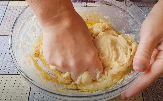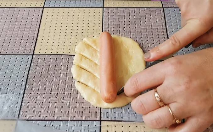 2. Если тесто слишком сильно липнет, смазываю его растительным маслом. Тесто получается мягким и слегка липким. Так изделия из него будут воздушными. Миску смазываю растительным маслом, выкладываю в нее тесто, накрываю. И оставляю для подъема в духовке с включенной электролампочкой на 1,5-2 часа. Тесто очень хорошо поднялось. Смазываю руки растительным маслом и обминаю его. Выкладываю на стол и делю на кусочки по 50-55 гр. У меня вышла 17 кусочков. Округляю их. Накрываю и оставляю на 10 минут. Формирую сосиски. Растягиваю кусочек теста руками в овальную лепешку. На середину кладу сосиску, по бокам делаю косые надрезы. Заплетаю косичку. Концы закрепляю. Перекладываю на противень.