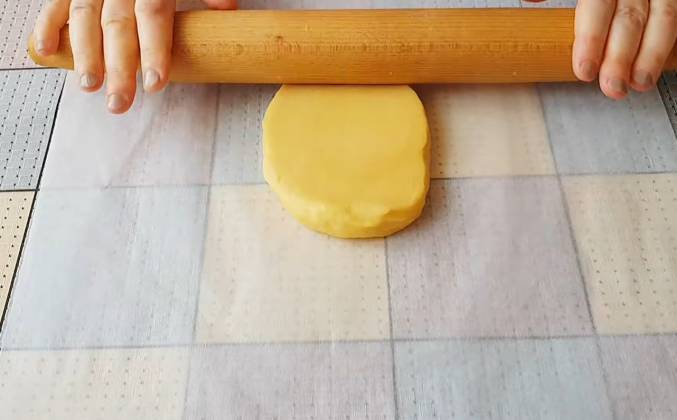 2. Добавляю немного горячего молока, чтобы смесь стала более жидкой. Переливаю в кастрюльку к горячему молоку, постоянно помешивая. Ставлю на огонь и завариваю крем. Крем заварился. Перекладываю его в чистую тарелку и оставляю остывать. Достаю тесто из холодильника. Оно остыло и стало более плотным. Делю его на 2 части. Раскатываю одну часть на пергаменте в тонкий пласт. Для лучшего раскатывания накрываю тесто сверху пергаментом. Толщина пласта около 3 мм. Выемкой 7 см диаметром вырезаю печенье. Выкладываю на противень застеленный бумагой для выпечки. Со второй частью теста поступаю так же. Обрезки собираю, раскатываю и тоже вырезаю печенье. Всего их получилось 25 штук. Выпекаю их при температуре 180 градусов.