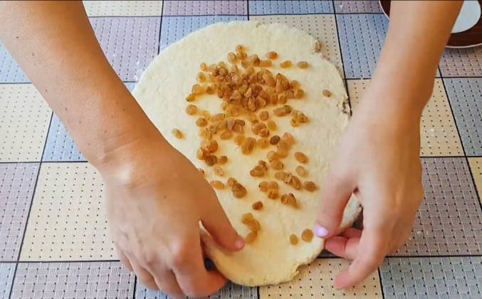 2. Подпыляю стол мукой. Выкладываю тесто. И быстро вымешиваю. Тесто должно сьать не липким, но остаться мягким. Вот такое оно получается. Теперь раскатываю тесто в пласт. Высыпаю на него 50 г изюма. Складываю. И вмешиваю изюм в тесто. Тесто выкладываю на пергамент и раскатываю в круг. Толщина пласта должна получиться около 1,5 см. Разделяю на сегменты. Раздвигаю их на небольшое растояние друг от друга.