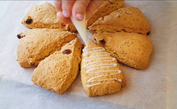 3. Перекладываю пергамент вместе со сконами на противень. И отправляю выпекаться в духовку, разогретую до 200 С. Пока сконы выпекаются приготовлю глазурь. 25 г сахарной пудры смешиваю с 1 ч л лимонного сока. И хорошо перемешиваю. Глазурь готова. Сконы выпекались 17 минут. Ёще горячими украшаю их глазурью. Разломим булочку и посмотрим, какая она внутри. Мягкая, рассыпчатая, вмеру сладкая, с ярким цитрусовым вкусом и ароматом.Видео рецепт ютуб ниже 👇