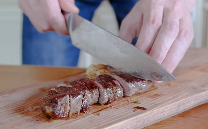 3. Самая ценная часть у любого животного? Так сказать, какая трофейная часть? Я думаю у всех правила одинаковые. Например тот кто выстрелил, тот забирает голову, язык, губы - это эксклюзив определенный. Остальные части по договоренности мы делим на всех. У нас все готово. Красиво нарезаем, горяченькое! Приправляем. И последний штрих - поливаем соусом. Поливаем горячее мясо. Классно! Все просто! Друзья, вот такой легкий способ приготовления стейка, а также классный гарнир к нему готов!Видео рецепт ютуб ниже 👇
