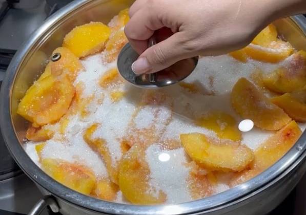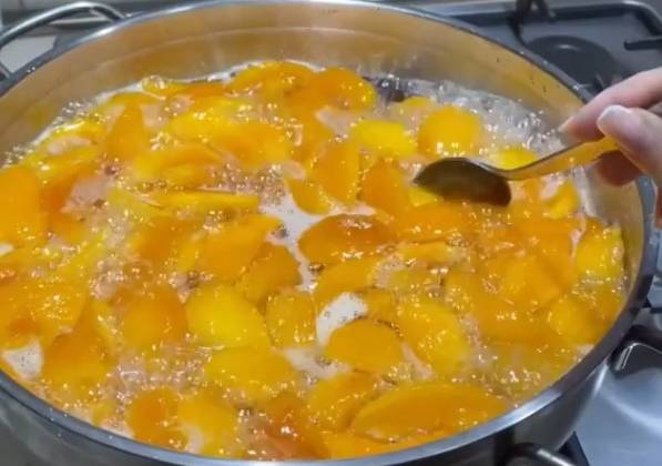2. Лучше готовить с вечера, оставить на ночь. На утро персики пустят сок, нужно выловить из шумовкой , переложить в отдельную посуду, сироп размешать(на дне осядет сахар), довести до кипения, снять пенку, вложить персики и варить на среднем огне минуты 2. Снять с огня и оставить остывать на 8 часов.