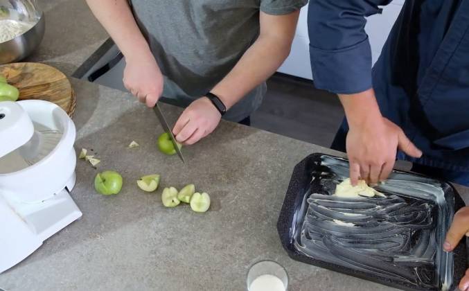 Шарлотка на противне с яблоками в духовке рецепт. Это чудесное блюдо, которое было придумано человечеством, специально чтобы спасти нас от безумного количества яблок. Которые нас захватывают осенью. И конечно же именно осенью нам надоедает их есть и хочется чего-то веселенького. Так, чтобы можно было яблоки кушать вместе с чаем. Такого не бывает, поэтому будем есть шарлотку, в которой яблоки и будут. Классно, погнали? Давай! Обычно шарлотку я готовлю вечером. Мыть посуду не хочется, поэтому сразу кидаю сюда. Трое детей - это значит их обязательно нужно чему-то учить на кухне, развлечь. Именно в этот ответственный момент у нас на сцене появляется заколдованная принцесса.
