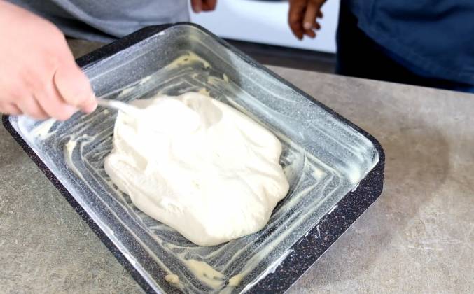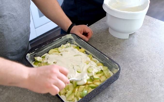 3. Я очень очень боюсь мочить руки))) и мыть доски соответственно. Я режу прямо на столе. Столешница конечно специальная. Специально понижаем скорость, чтобы мука у нас не начала вылетать. Потихонечку досыпая с краев, добавляем примерно такое же количество муки. Наверное хватит. Густая сметана. Как сметана. Сначала выложим половинку. Потом выбрасываем сюда яблоки. И сверху заливаем. Тесто размазали, дальше яблоки. Равномерно выкладываем. Чем красивее рисунок, тем вкуснее шарлотка, проверено! Финальная стадия. Запекаем в заранее подготовленной духовке на 180 градусов мы выдерживаем блюдо минут 45. Красота какая получилась. Получился шедевр! Я в восторге!Видео рецепт ютуб ниже 👇