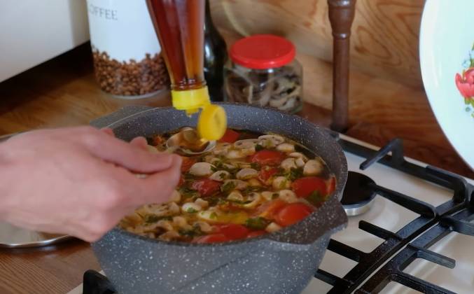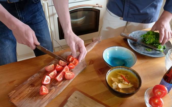 2. Судя потому что ты это уверенно делаешь, наверное это одно из любимых твоих блюд. Я нарежу грибы. Знаю что ты увлекаешься активно экстремальным спортом. И одно из увлечений - это серфинг. В наших краях я увлекаюсь Виндсёрфингом. Это доска с парусом. Я нарежу томаты крупно. Нарежем кинзу. Такой наваристый суп получается. Очень насыщенный. Скажи пожалуйста, нужно ли солить этот суп? Солить не надо, у нас есть готовый набор для супа, в котором присутствуют все ингредиенты. Тут все корнеплоды, перец, все лучшее что дала природа. Сейчас будем добавлять его в суп. Тут видны и перец, и лайм, и корнеплоды.