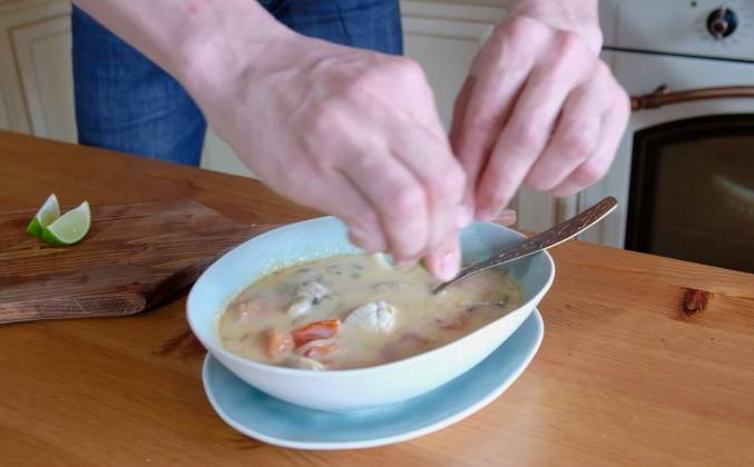 3. Так, сейчас попробуем суп. Будем его приправлять рыбным соусом. Я положу пару ложек. Нужно готовить по своему вкусу. Сейчас попробуем. Добавляем последний ингредиент - сливки. Сливки добавляем и выключаем газ. Так же можно использовать молоко. Так, суп закипел, закрываем газ, закрываем крышку, даем настояться 15 минут. Чтобы вкусы всех ингредиентов соединились. Получится идеально. Классно друзья, помните, что кокосовые сливки добавляют еще более мягкий вкус. Если вы не любите остроту или избыточную пряность, то для вас это будет отличным бонусом. Последний ингредиент - лайм.Видео рецепт ютуб ниже 👇