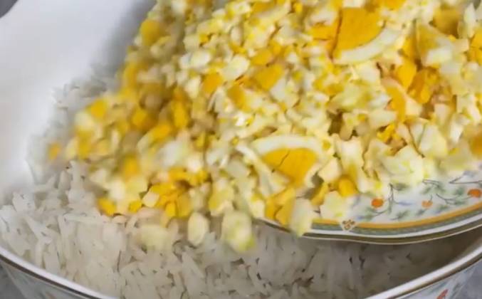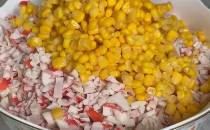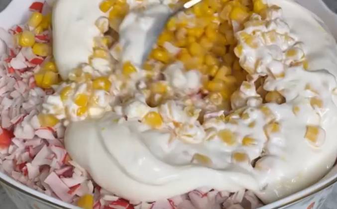Крабовый салат с рисом, кукурузой, яйцом и майонезом