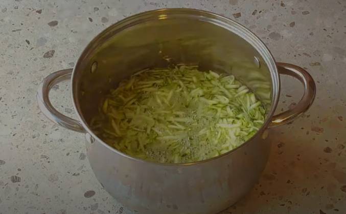 2. Натрите его на тёрке с мелкими желобковыми отверстиями или пропустите через картофельный пресс. Избыточно водянистые сорта не подойдут для этого рецепта. Велик риск, что котлеты с таким картофелем расплывутся на сковороде. Хорошенько отожмите остывшие кабачки: ведь поджарить воду никому ещё не удавалось. Отправьте их в миску с картофелем. Добавьте соль, перец, чесночный порошок и мускатный орех. Тщательно вымесите.