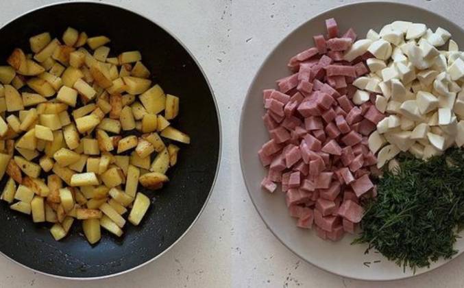 Слоеный пирог с картошкой, ветчиной и сыром моцареллой