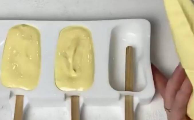 2. Постепенно масса будет увеличиваться в объеме и побелеет. Взбиваем массу примерно 7-10 мин. Время взбивания зависит от мощности миксера и объёма массы. Берем силиконовую форму, хорошо смазываем растительным маслом, вставляем палочки. Заполняем форму маршмеллоу, вставляем палочки для эскимо и даём стабилизироваться не менее 5-6 ч.