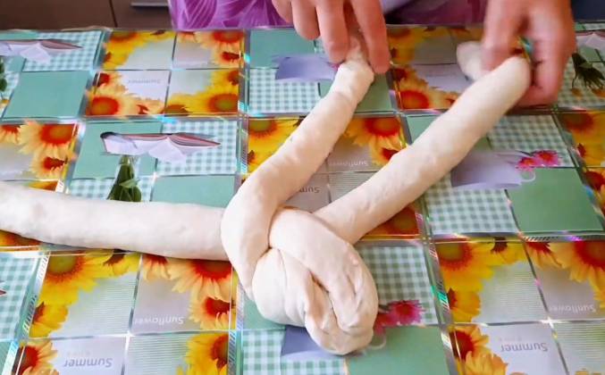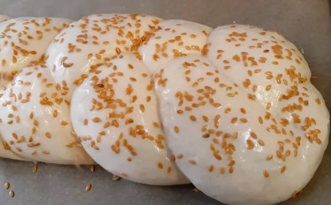 3. Каждый кусочек обнимаю. И растягиваю в прямоугольник. Толщина пласта должна быть приблизительно 0,5 сантиметра. Плотно скручиваю тесто рулетом, край хорошо защипываю. Так формирую 3 рулета. Скрепляю их вместе с одной стороны и переплетаю косичкой. Туго затягивать не нужно. Просто перекладываете кусочки теста с одной стороны на другую. Края закрепляю под низ и переношу хлеб на противень, застеленный пергаментом. Накрываю пленкой и оставляю для подъема на 40-45 минут при комнатной температуре. Хлеб хорошо подошел. Смазываю его молоком, если вы не хотите присутствие молока в вашей выпечке, просто смажьте его водой. Посыпаю белым льном, можно посыпать любыми семечками или ничем не посыпать. И отправляю выпекаться в духовку разогретую до 180 градусов. Прошло 35 минут. Хлеб готов.Видео рецепт ютуб ниже 👇