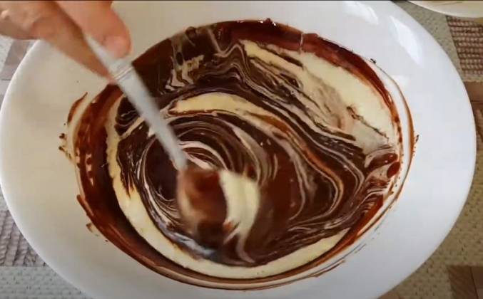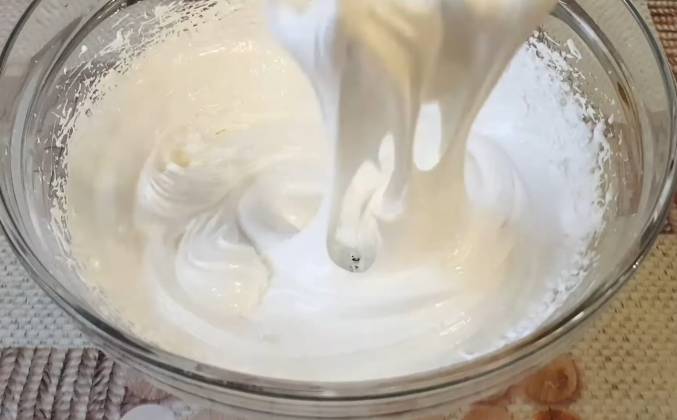 2. Когда смесь стала однородной, просеиваем в нее 125 гр муки и 50 гр какао. Хорошо перемешиваем. Получаем жидкое, как на оладьи тесто. Форму для выпечки застилаем пергаментом, чтобы потом легко извлечь готовый десерт. И выливаю в него тесто. У меня форма 17 на 17 сантиметров. Высота теста в форме должна составлять 2-3 сантиметра. Выпекается брауни в духовке разогретой до 180 градусов. Тем временем приготовим швейцарскую меренгу. Соединяю 150 гр сахара и 2 белка. Перемешиваю и ставлю на водяную баню. Постоянно помешивая до полного растворения сахара и появления пенки. Сахар растворился. Меренга хорошо прогрелась. Снимаю с огня и взбиваю миксером.