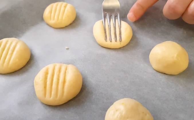 3. Когда закончили формировать все печенья, их можно придавить. Я придавливаю вилкой. Тесто при выпечке не растикается, поэтому сразу делайте их такой толщины какой пожелаете. Толстенькие будут более мягкими, тоненькие более хрустящими. Выпекаю в духовке, разогретой до 175 градусов, 12-14 минут. Мои печенья пеклись 14 минут. Выходит из этой порции 45 печений. Они получаются очень светлые, почти белые. Выкладываю их на блюдо и слегка присыпаю сахарной пудрой.Видео рецепт ютуб ниже 👇