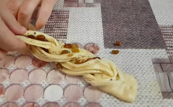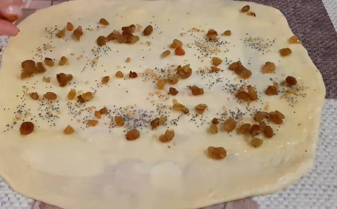 3. Смазываю тесто мягким сливочным маслом. Присыпаю смесью льна и мака. И изюмом. Вы можете взять любые семена и сухофрукты. Скручиваю тугим рулетиком. Прижимаю рулетик делая его более плоским. И разрезаю вдоль ножом не доходя до края 1-2 см. Край приминаю. А концы перемлитаю между собой. Формирую косичку. Теперь скручиваем булочку. Концы прячем под низ булочки. Заворачиваем. И второй конец тоже прячем под низ булочки. И сверху прижимаем, чтобы при выпекании булочка не раскрылась. Переношу ее на противень. Так формирую все булочки. Раскатываю тонкий пласт теста. Смазываю его маслом. Присыпаю семенами льна и изюмом. Скручиваю в рулет. Рулет приминаю, делая более плоским. И разрезаю вдоль на две части. Край приминаю. А концы переплетаю между собой косичкой. Скручиваю булочку, пряча оба конца под низ булочки.