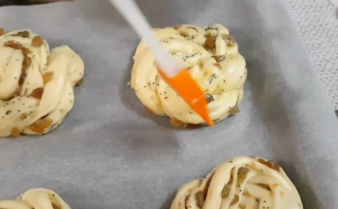4. Приминаю посередине. Переношу на противень. Когда все булочки сформированы. Накрываю их. И оставляю для подъема на 30-40 минут. Булочки подошли. Смазываю их смесью 1 желтка и 1 ст л молока. Отправляю выпекаться в духовку при 180 С на 20-25 минут. Пока булочки выпекаются, приготовлю сироп для смазывания. 2 ч л сахара смешиваю с 2 ст л воды в сотейнике. Сотейник ставлю на огонь. Сиропу достаточно просто закипеть. И он готов. Булочки выпекались 23 минуты. Сразу, пока они еще очень горячие, смазываю их сиропом. Это придаст блеск и дополнительную сладость. Вот такие булочки у нас получились. Они равномерно поджаренные со всех сторон.Видео рецепт ютуб ниже 👇
