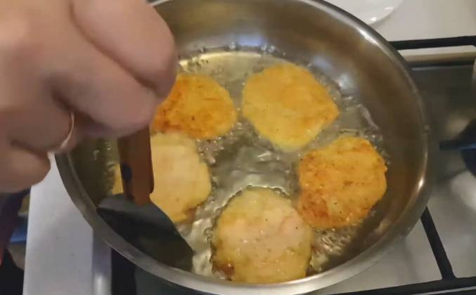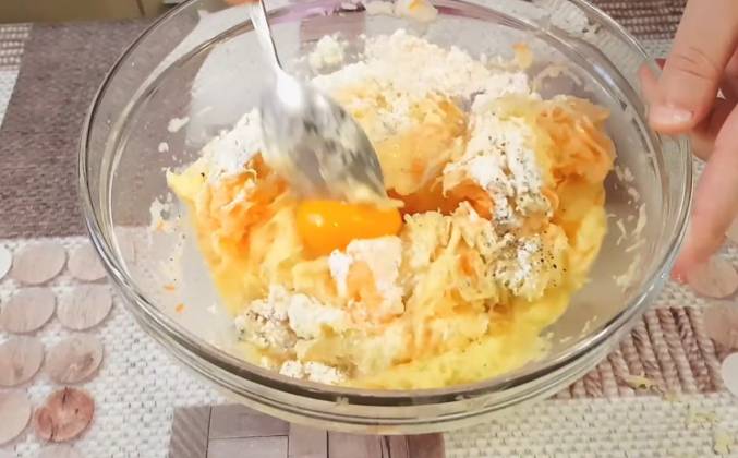 2. Так они будут еще красивее и вкуснее. К натертым овощам добавляю одно яйцо и одну столовую ложку муки. Солю и перчу по вкусу. Хорошо перемешиваю картофельную массу. На разогретую сковороду наливаю небольшое количество растительного масла. И выкладываю ложкой драники. Обжариваю с двух сторон до румяной корочки. Готовые драники перекладываю на блюдо.