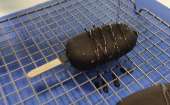 3. Печется чизкейк долго и при низкой температуре. И эскимо не исключение. 100 - 110 градусов 60 минут. Оставляем в приоткрытой духовке до полного остывания. На это у вас уйдет еще пару часов. Полностью остывший чизкейк убираем вместе с формой в морозилку. Минут на 20 - 30. Его не обязательно замораживать в камень. Достаточно просто хорошо охладить. В это время импульсно в микроволновке топим шоколад до хорошего текучего состояния. Достаем из морозилки эскимошки. Вытаскиваем их из формы. И, держа за палочку, окунаем в глазурь. Даем стечь излишкам. Из-за разницы температур шоколад моментально застывает. Шоколад можно использовать любой на ваш вкус. Я больше люблю работать с глазурью, так как она пластичнее и ее не нужно темперировать. Единственный совет - выбирайте качественный продукт. Ведь его вкус очень сильно отразится на общем вкусе десерта. Глазируем все и можно приступать к декорированию. И, кстати, сырной массы из этого рецепта как раз хватит, чтобы приготовить классический чизкейк New York в форме 18 - 20 см в диаметре.