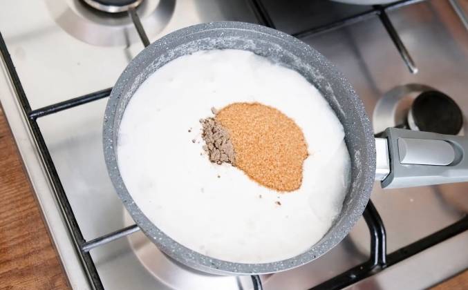 2. Высыпаем кешью в сухую сковородку и начинаем обжаривать. Кешью готов, теперь перекладываем в полотенце для того чтобы он остыл. Рис необходимо слегка посолить. Теперь нам необходимо добавить кокосовое молоко. Сахар, я использую коричневый. И ванильный сахар. Перемешиваем.
