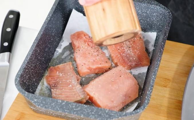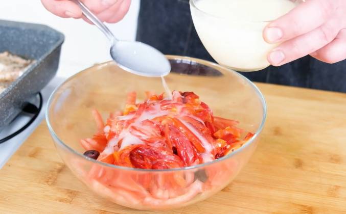 3. Кладем рыбу и запекаем до готовности. Далее наши пропеченные перцы извлекаем, удаляем плодоножку, семена. Излишки воды необходимо просушить бумажным полотенцем. Далее необходимо снять кожу. Бумажным полотенцем это сделать легче. Далее необходимо нарезать запеченный перец соломкой. Рыба готова, извлекаем. Теперь необходимо заправить наш салат заправкой. Перемешиваем. Салат готов.Видео рецепт ютуб ниже 👇