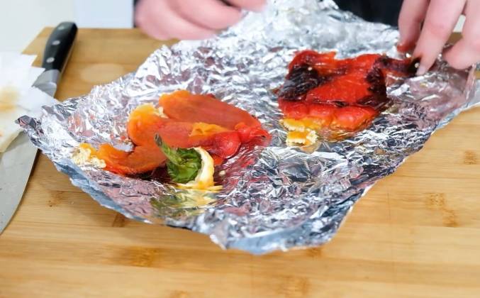 2. Делаем заправку для салата. Для этого мы смешиваем сок лимона, оливковое масло, добавляем небольшое количество соли, чеснок. Теперь все необходимо взбить блендером. Перцы пропеклись, вынимаем. Перцы перекладываем в фольгу и заворачиваем. В противень кладем бумагу для выпекания, рыбу, солим. Отправляем запекаться в духовку, убавляем силу огня до 200 градусов.