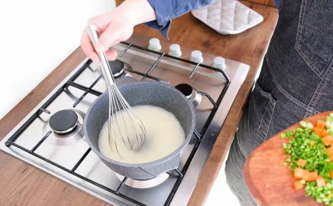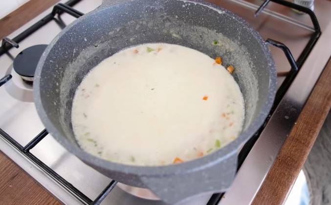2. Ставим кастрюлю на огонь и кладем в нее сливочное масло. Растапливаем масло, снимаем с огня. Добавляем муку и воду, перемешиваем. Теперь добавляем овощи. Овощи и готовим 15 минут. Смешаем следующие ингредиенты: желток кайенский перец, сок лимона и сливки.