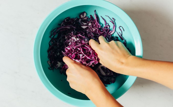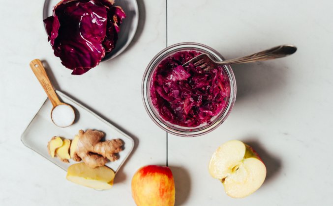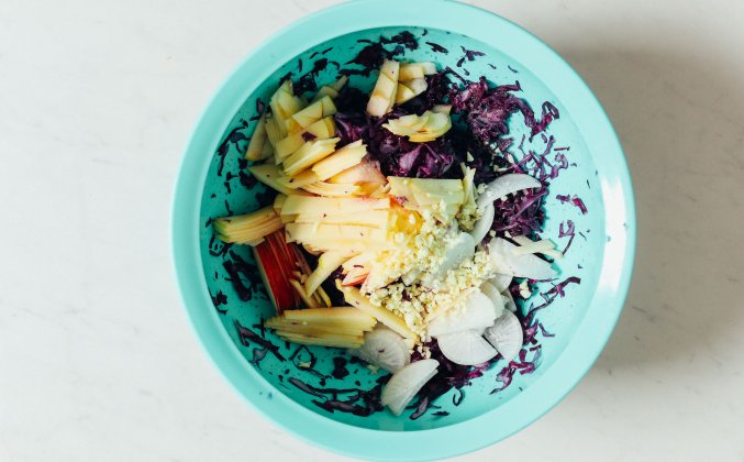 2. Добавьте редьку, яблоко, имбирь и чеснок и еще раз помассируйте чистыми руками в течение 4-5 минут до полного смешивания. Затем попробуйте на вкус и откорректируйте, добавив больше соли для солености, тертый имбирь для большего количества остроты или чеснок для более интенсивного чесночного вкуса. Чистыми руками положите смесь квашеной капусты в стерилизованные банки и плотно прижмите. От "массажа" капусты должно выделиться достаточно жидкости, чтобы подняться и покрыть овощи. Если этого не происходит, долейте фильтрованную воду до тех пор, пока она не будет покрыта (маловероятно, что вам нужно будет добавлять воду). Кроме того, убедитесь, что между содержимым и крышкой достаточно места (около 2,5 см), чтобы в банке было место для повышения уровня жидкости. Запечатайте с крышкой и установите на стойку, где не много прямых солнечных лучей - или в шкафу. Идеальная температура для брожения - выше 18 C, поэтому старайтесь держать банку в тепле, чтобы обеспечить правильное брожение.